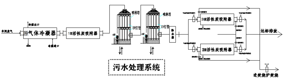 針對該工況的特殊性及復雜性,以及現場工況和客戶預算的實際情況,本方案采用活性炭吸附脫附多級治理+水霧分離器+uv光氧綜合治理的方法,示意圖如下