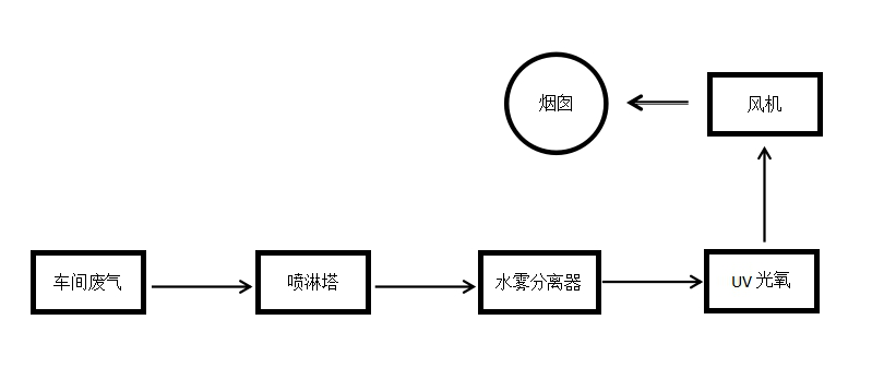 工藝路線:采用噴淋塔+UV光氧工藝。廢氣進入噴淋塔+UV光氧進行吸附凈化,凈化達標后直接排放;