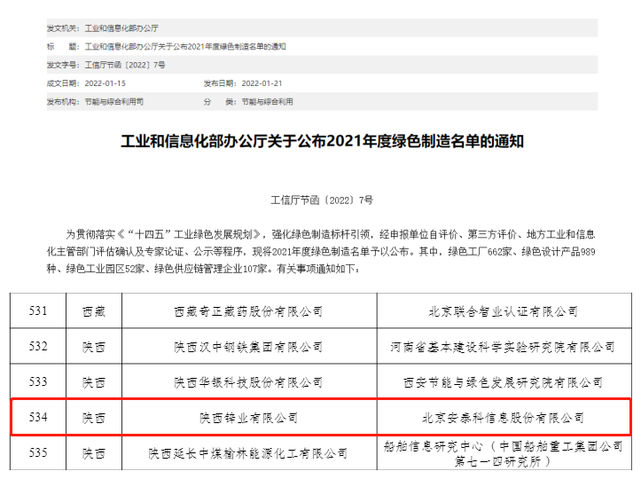 喜訊!陜西鋅業有限公司入選國家級綠色工廠